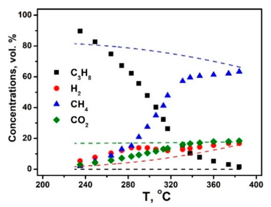 Figure 1 shows the temperature dependences of the outlet concentrations of propane, methane, carbon dioxide, and hydrogen during propane pre-reforming under 1 bar pressure, with a H