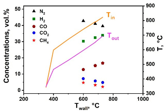The temperature at the catalyst inlet exceeded the reactor wall temperature (730 °C) and the outlet temperature, which was associated with the exothermic reaction of complete oxidation of methane and hydrogen. The outlet temperature, on the contrary, did not exceed the temperature of the walls of the reactor, which was due to the endothermic reactions of steam and dry reforming of methane. In this case, with an increase in the flow rate, T