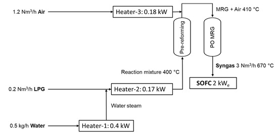 7]. In the case of a SOFC stack with power of several kilowatts or more, the heat released during the reaction can be efficiently utilized to conduct endothermal steam reforming of the initial fuel. This increases the efficiency of the entire system (reformer + SOFC system). For small power SOFCs, usually less than 1–2 kW, the heat generated is not always enough to simultaneously maintain the required stack temperature and for endothermic steam reforming. In this case, it is preferable to use an exothermic partial oxidation process: