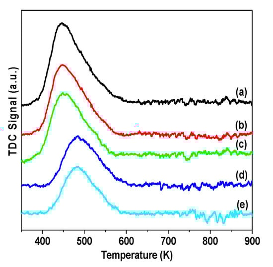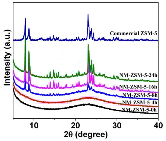 Figure 5 shows the NH3-TPD curves of the samples. All the samples show a NH3-desorption peak. The sample NM-ZSM-5-0h has a broad desorption peak at around 446 K, indicating that the acidity of the sample is weak due to low crystallization []. As the pre-crystallization time is prolonged, the desorption peak temperature of NH3 gradually increases, indicating that the acidity is enhanced with the increase of microporous crystallinity []. For example, for NM-ZSM-5-4h, NM-ZSM-5-8h, NM-ZSM-5-16h, and NM-ZSM-5-24h, the NH3-desorption peak is located at 449 K, 452 K, 485 K, and 486 K, respectively. The desorption peaks of samples NM-ZSM-5-8h, NM-ZSM-5-16h, and NM-ZSM-5-24h can be attributed to the desorption of NH3 from medium acid sites []. As a whole, the acidity of the hierarchical silicon-alumina material is not strong and suitable for medium-strength acid-catalyzed reactions.