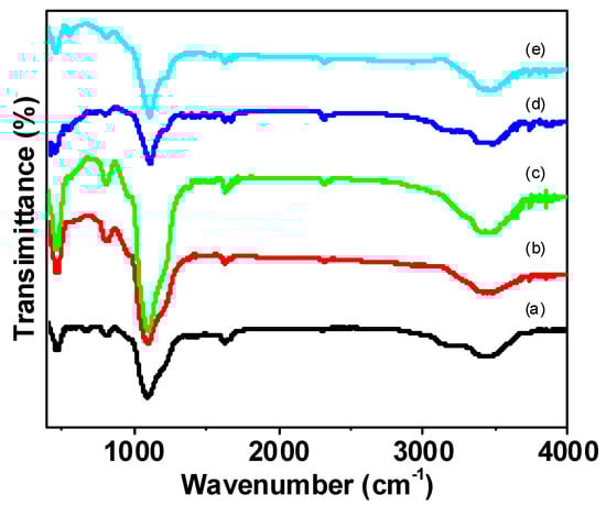 Figure 2 shows the FT-IR spectra of the samples. The absorption peak at 465 cm−1 is ascribed to Si–O–Si (Al) variable angle bending vibration, while the absorption peak at 810 cm−1 belongs to Si–O–Si (Al) symmetric stretching vibration. Moreover, the peak at 1080 cm−1 is due to Si–O–Si (Al) anti-symmetric stretching vibration, whereas the bands at 1639 cm−1 and 3430 cm−1 are attributed to O–H bond bending vibration of water and Si–OH or O–H bond stretching vibration of water, respectively []. For pre-crystallization micro-mesoporous materials at 8 h, 16 h, and 24 h, the characteristic peak at 550 cm−1 indicates MFI structure (Figure 2c–e) []. However, the ZSM-5 zeolites crystallized at 0 and 4 h do not have this characteristic peak, indicating that the pre-crystallization time is too short and the MFI structure of ZSM-5 is not formed. Therefore, prolonging the pre-crystallization time favors the formation of the microporous structure.