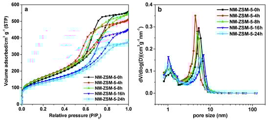 Figure 3b exhibits the pore distribution of the silica-alumina materials. The silica-alumina materials pre-crystallized at different times contain bi-continuous micropore and mesopore distribution. The microporous distribution is mainly centered at about 1 nm, while the mesopore distribution is mainly concentrated at around 6 nm. For the samples with shorter pre-crystallization time (i.e., NM-ZSM-5-0h, NM-ZSM-5-4h and NM-ZSM-5-8h), the distribution of mesopores is relatively concentrated. When the crystallization time is extended to 24 h, the distribution is relatively broad, which is related to the decrease of the mesoporous order degree.