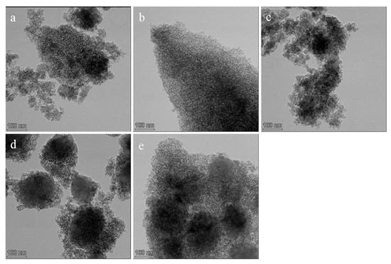 The Fourier Infrared Spectroscopy (FT-IR) was performed on an IRAffinity-IS Fourier Infrared Spectrometer (Shimadzu Corporation, Kyoto, Japan). X-ray powder diffraction (XRD) was performed on a D8 type X-ray powder diffractometer (Bruker, Karlsruhe, Germany). For N2 physical adsorption, the specific surface area and pore volume of the sample are measured on a Micromeritics ASAP 2010 type adsorber (Micromeritics, Atlanta, GA, USA). The sample was degassed at 573 K for 3 h before the sample was measured. Adsorption is performed at the temperature of liquid nitrogen, and N2 is the adsorbate. Under relative pressure P/P0 = 0.05–0.20, the BET specific surface area is calculated using the BET equation. The high-resolution transmission electron microscope (TEM) was performed on a Tecnai G2 F20 high-resolution transmission electron microscope (FEI Company, Hillsboro, OR, USA).