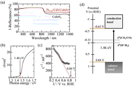 Figure 2a shows UV-vis-NIR absorption spectra of the CuInS2 and Pt0.88/CdS/CuInS2 films. As reported in the literature, the CuInS2 film showed intense absorption over a wide wavelength range from 300 to 850 nm [,,]. The bandgap was calculated to be 1.46 eV using a Tauc plot (Figure 2b), and the flat band potential was determined to be approximately 0.84 V using a Mott–Schottky plot (Figure 2c), indicating that the band position of the prepared CuInS2 film (Figure 2d) was in accordance with that previously determined by photoelectron spectroscopy [,]. The Pt0.88/CdS/CuInS2 film showed an absorption spectrum similar to that of the CuInS2 film, with an increase in absorption being observed at wavelengths above 820 nm (Figure 2a). The origin of this increased absorption is considered to be light scattering by the deposited Pt, which has often been observed for photocatalysts modified with Pt nanoparticles [,].