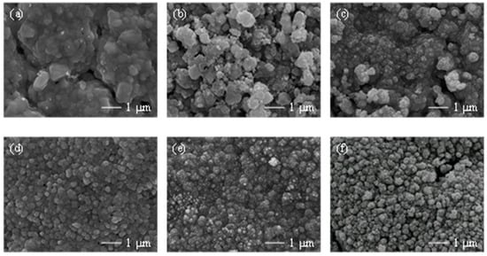 SEM images of (a) CdS/CuInS2, (b) Pt0.22/CdS/CuInS2, (c) Pt0.44/CdS/CuInS2, (d) Pt0.66/CdS/CuInS2, (e) Pt0.88/CdS/CuInS2, and (f) Pt1.00/CdS/CuInS2.