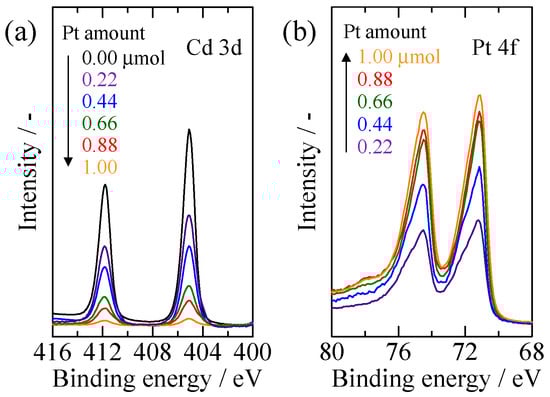 This suggestion was supported by the XPS results. Figure 4a,b shows the XPS spectra of CdS/CuInS2 and Pt/CdS/CuInS2 films for the Cd 3d (Figure 4a) and Pt 4f (Figure 4b) regions, respectively. As Pt loading was increased, the Cd 3d peaks significantly weakened while the Pt 4f peaks became stronger, with the Cd 3d peaks almost disappearing in the case of Pt100/CdS/CuInS2. On the basis of these results, it was anticipated that the CdS layer could be protected during PEC H2 evolution by depositing Pt onto the surface.
