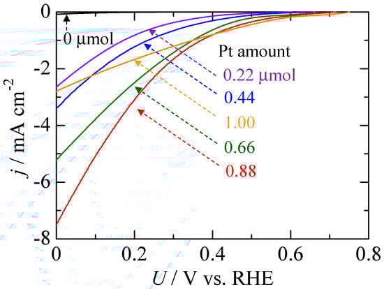 The PEC properties of the prepared electrodes were examined by linear sweep voltammetry measured under visible light irradiation. Although the bare CuInS2 electrode showed limited photoresponse (Figure S4), a distinct cathodic photocurrent was generated after modification with both CdS and Pt. This is because the CdS layer deposited on CuInS2 possessed suitable band characteristics for the formation of a p–n junction (Figure 2d and Figure S5), facilitating extraction of excited electrons from the inside of CuInS2 to the electrode surface, while Pt acted as a cocatalyst to reduce overpotential for H2 evolution. Consequently, modification with these materials enabled the extraction of photoexcited electrons from CuInS2 to the electrolyte. In contrast, the modification with only CdS made no increase in photocurrent (Figure S4). Figure 5 shows polarization curves of the Pt-modified CdS/CuInS2 electrodes with different Pt contents. As the amount of Pt was increased up to 0.88 µmol, a gradual improvement in photocurrent density and a positive shift in the onset potential were observed; in contrast, the increase in Pt loading had almost no effect on current generation under dark conditions (Figure S6). However, further increases in Pt content above 0.88 µmol were detrimental to current density, as excess Pt loading limited light absorption by CuInS2. Thus, the largest photoresponse was observed for Pt0.88/CdS/CuInS2, with its photocurrent reaching 7.5 mA cm−2 at 0 V. This value is about half of the photocurrent recorded using the Pt/CdS/(CuInS2)0.81 (ZnS)0.19 electrode which is a state-of-the-art CuInS2-based photocathode prepared by tuning the band position of the light absorber [].