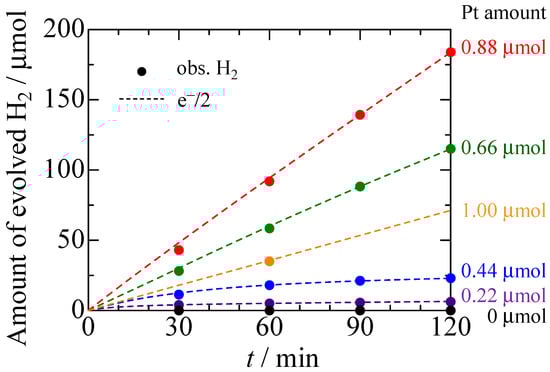 To confirm the H2 generation ability of the Pt/CdS/CuInS2 electrode, the amount of H2 evolved during photoelectrolysis was quantified. Figure 6 shows the typical time courses of H2 evolution over the Pt/CdS/CuInS2 photoelectrodes with an applied potential of 0 V and one-half of the electrons passing through the outer circuit (e–/2). Continuous H2 production was observed for all the photoelectrodes, and approximately 180 µmol of H2 generated over Pt0.88/CdS/CuInS2 after illumination for 120 min. The faradaic efficiency, defined as the ratio of the amount of H2 to that of e–/2, was calculated to be over 99% for all the Pt/CdS/CuInS2 photoelectrodes, indicating that no reduction reactions other than H2 evolution proceeded, irrespective of the amount of Pt.