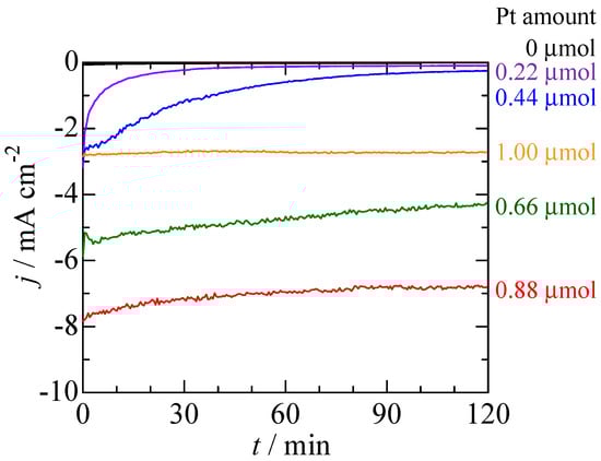 Figure 7 shows typical photocurrent time profiles measured during PEC H2 evolution experiments. These results indicate that the stability of the Pt/CdS/CuInS2 photoelectrodes significantly depended on the Pt loading. Although rapid photocurrent decays were observed for Pt0.22/CdS/CuInS2 and Pt0.44/CdS/CuInS2, a significant improvement in the stability was observed at higher Pt loadings, with Pt100/CdS/CuInS2 retaining 99% of its photocurrent after photoelectrolysis. Photocurrent decay in CdS-modified photocathodes has previously been studied by several groups, and the phenomenon was attributed to the poor stability of CdS due to photocorrosion [,].