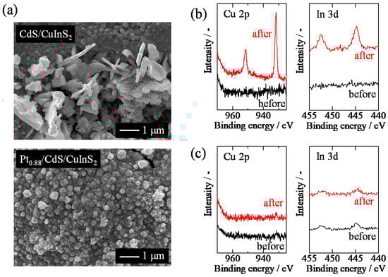 (a) SEM images of CdS/CuInS2 (upper) and Pt0.88/CdS/CuInS2 (lower) photoelectrodes after 120 min of photoelectrolysis. (The SEM images of CdS/CuInS2 and Pt0.88/CdS/CuInS2 photoelectrodes before the photoelectrolysis are shown in Figure 3a,e, respectively.) Comparison of XPS spectra of (b) CdS/CuInS2 and (c) Pt0.88/CdS/CuInS2 electrodes before and after 120 min of photoelectrolysis.