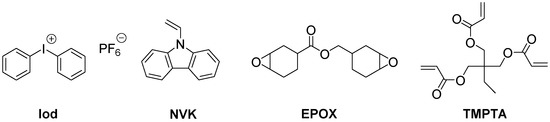 - Fouassier, J.-P.; Lalevée, J. Photoinitiators for Polymer Synthesis: Scope, Reactivity, and Efficiency; John Wiley & Sons: Weinheim, Germany, 2013. [Google Scholar]
