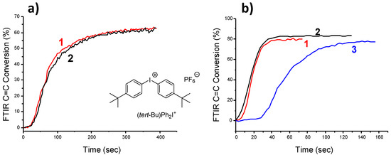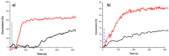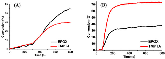 Polymerization profiles of an EPOX/TMPTA blend (50%/50%, w/w) using the three-component Cu-2/Iod/NVK (0.1%/3%/5%, w/w/w) system under air (A) and in laminate (B), irradiation with a halogen lamp. Reproduced with permission from the authors of [62]. Copyright 2014 The American Chemical Society.