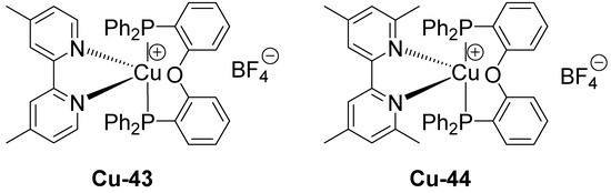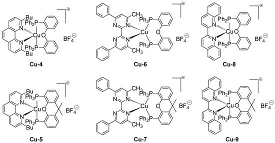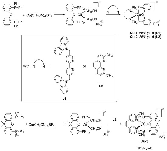 Concerning their syntheses, the three complexes (Cu-1–Cu-3) could be prepared in high yields using a stepwise approach. By first complexing the bulky phosphorylated ligands (DPEPhos or XantPhos) with one equivalent of tetrakis (acetonitrile)copper (I) tetrafluoroborate (Cu(CH3CN)4.BF4) and then opposing the appropriate ancillary ligand to the intermediate complex, a ligand exchange could occur, and the heteroleptic complexes Cu-1–Cu-3 could be prepared with reaction yields ranging from 66% for Cu-1 to 86% for Cu-2 (See Scheme 1) [62]. Complexes could also be isolated by precipitation, facilitating the purification process. The way how to recover these complexes is totally different to that used for the previously mentioned iridium complexes that could only be synthesized in low yields, but also required an extensive purification process to be obtained in pure form [37,38,39,40,41,42].