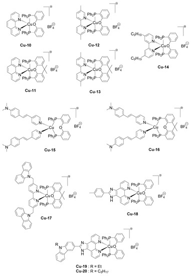 - Czerwieniec, R.; Leitl, M.J.; Homeier, H.H.H.; Yersin, H. Cu(I) complexes—Thermally activated delayed fluorescence. Photophysical approach and material design. Coord. Chem. Rev. 2016, 325, 2–28. [Google Scholar] [CrossRef]