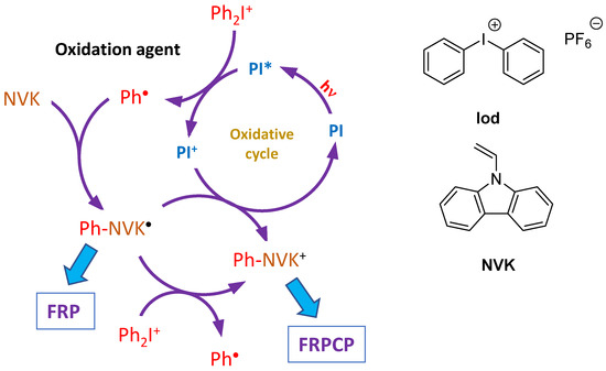 Prior to the polymerization tests, examination of the photochemical stability of the different complexes in solution revealed Cu-2 to be sensitive to the solvent polarity. Thus, irradiation at 405 nm of an acetonitrile solution of Cu-2 revealed the appearance of a new band in the UV–visible absorption spectrum, assigned to the formation of Cu(L2).BF4, consistent with the results previously reported in the literature [77,78]. Indeed, ligand displacement is sometimes observed for sterically hindered complexes upon photoexcitation, during the structural rearrangement from the initial octahedral geometry to the square planar geometry. Conversely, in dichloromethane, no modification of the absorption spectrum was found for Cu-2 even after 20 min of irradiation at 405 nm [79]. Examination of the Cu-x (x = 1−3)/Iod interaction by ESR spin trapping experiments revealed the formation of Ph• radicals, capable to initiate the FRP of acrylates [62]. Upon addition of NVK into the resin, Ph• radicals generated within the resin can add onto the double bond of NVK and produced Ph-NVK• radicals that can be easily oxidized by the iodonium salt, furnishing Ph-NVK+ cations capable to initiate the FRPCP of epoxides (see Figure 4). Noticeably, use of NVK as an additive also allows an efficient regeneration of the photosensitizer, rendering the photoinitiating system catalytic.