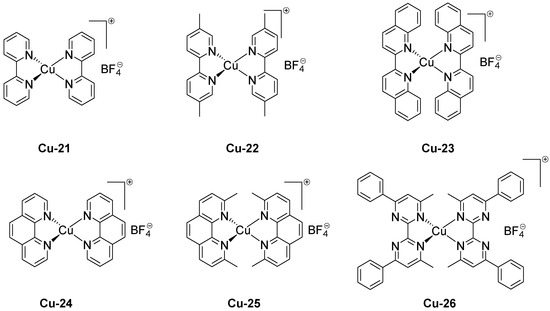 - Lennert, A.; Guldi, D.M. Homoleptic and Heteroleptic Copper Complexes as Redox Couples in Dye-Sensitized Solar Cells. ChemPhotoChem 2019, 3, 636–644. [Google Scholar] [CrossRef]