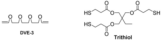 Returning to Cu-18, the same authors also demonstrated the possibility for this complex to act as a photoredox catalyst for the thiol-ene polymerization of a tris(3-mercaptopropionate) (trithiol)-triethyleneglycol divinyl ether (DVE-3) blend (57%/43%, w/w) (see Figure 11). Upon irradiation with a laser diode at 457 nm, final monomer conversions of 57 and 85% could be, respectively, determined for trithiol and DVE-3, following the mechanism depicted in Equations (1)–(3) [80].