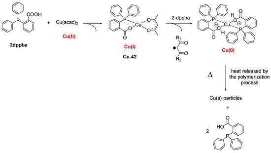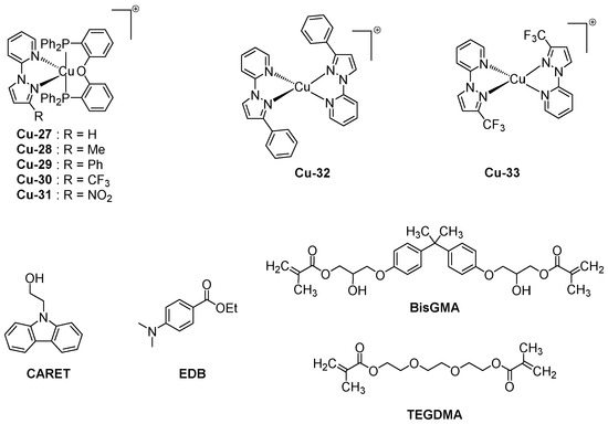 As discussed in the introduction section, the first report mentioning the use of photosensitive copper complexes in photopolymerization have been reported in 2014 [62]. In this work, two different bulky phosphorylated ligands were used, namely, bis(2-(diphenylphosphino)phenyl) ether (DPEPhos) and 4,5-bis(diphenylphosphino)-9,9-dimethylxanthene (XantPhos) for the design of Cu-1-Cu-3 (See Figure 2).