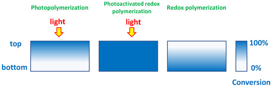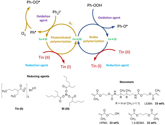 To avoid the formation of the less reactive ROO• radicals, introduction of a reductant that could reduce Cu (II) into Cu (I) was introduced, favoring Equation (6) over Equation (7). To optimize the initiating system and mutualize as much as possible the different additives used for both the redox and the photochemical mechanisms, the reductant used for the redox system can also be the same as that used in the photochemical mechanism. This goal was achieved by using Tin (II) 2-ethylhexanoate (Tin (II)) that could be simultaneously used for the photochemical and the redox polymerizations (see Figure 15). To favor the diffusion of radicals within the resin as well as oxygen diffusion, a resin of low viscosity was employed, composed of a mixture of three monomers, namely 1,4-butanediol-dimethacrylate (1,4-BDMA) (33 wt%), hydroxypropyl methacrylate (HPMA) (33 wt%) and urethanedimethacrylate (UDMA) (33 wt%). To evidence the reactivity of these hydroxyl radicals, a comparison with cumene hydroperoxide R’’OOH was established [28].