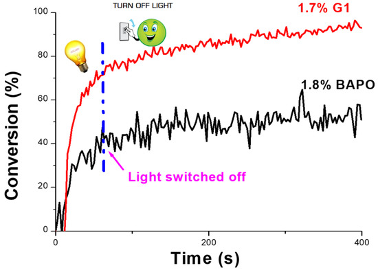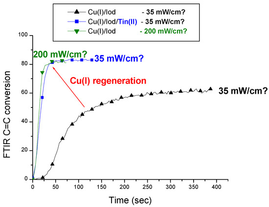 As the first finding, the final monomer conversion could be finely tuned by mean of the light intensity. Thus, by maintaining the light irradiation at 35 mW/cm², the monomer conversion could be drastically increased by replacing the two-component system Cu-4/Iod (0.3%/0.85% w/w) by the three-component system Cu-4/Iod/Tin (II) (0.3%/0.85%/6% w/w/w). Therefore, an enhancement of the final monomer conversion from 60 to 84% could be obtained within 150 s while regenerating the photosensitizer (see Figure 16) [28].