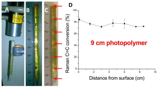 (A) Experimental set-up used to examine the polymerization in shadowed areas. (B) The Pasteur pipette with the resin before irradiation. (C) The resulting polymer obtained after polymerization. (D) Final monomer conversion vs. the distance of the irradiation point. Reproduced with permission from the authors of [28]. Copyright 2017 American Chemical Society.