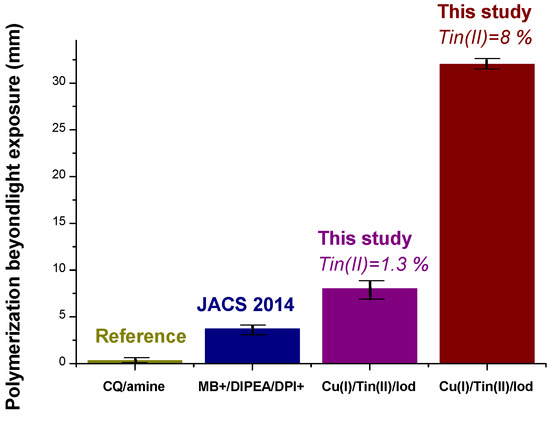 Determination of the polymerization length beyond the irradiated area using different systems previously reported in the literature (camphorquinone/amine: 0.4%/2% w/w and MB+/DIPEA/DPI+: 0.4%/0.2%/0.04% w/w/w) and Cu (I)/Iod/Tin (II) 0.17%/2%/1.3 w/w/w and Cu (I)/Iod/Tin (II) 0.17%/2%/8 w/w/w examined in this study. Reproduced with permission from the authors of [28]. Copyright 2017 American Chemical Society.