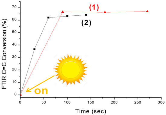 Photopolymerization profiles of the mixture of the methacrylate monomers using the three-component Cu-4/Iod/Tin (II) (0.2%/1%/5% w/w/w). Two different experiments were carried out to evidence the reproducibility. With sunshine (1) and without sunshine (2), reproduced with permission from the authors of [28]. Copyright 2017 American Chemical Society.