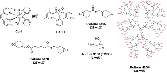 Cu-4 is a promising photosensitizer for future industrial developments and several studies were devoted to examine its photoinitiating ability with industrial resins (see chemical structures of the model resin in Figure 21) [102,103]. For comparison, BAPO, which is also widely used in industry, was used for comparison.