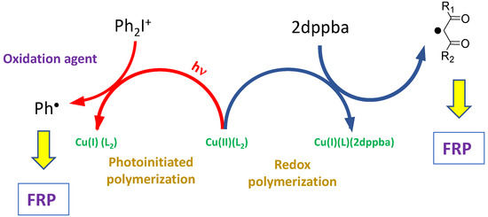 Parallel to the photoinitiated process, redox potentials of Cu-4 are also adapted to induce redox reactions with peroxides such as R’OOH so that R’O• and R’OO• radicals can be simultaneously generated in situ by redox reactions with Cu-4 (II) and Cu-4 (I) (see Equations (6) and (7)).