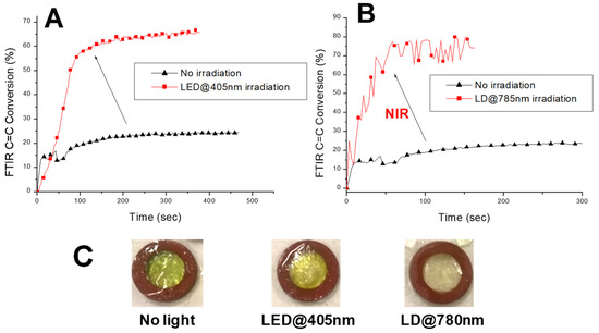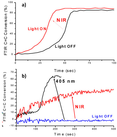 - Mokbel, H.; Dumur, F.; Lalevée, J. On demand NIR activated photopolyaddition reactions. Polym. Chem. 2020, 11, 4250–4259. [Google Scholar] [CrossRef]