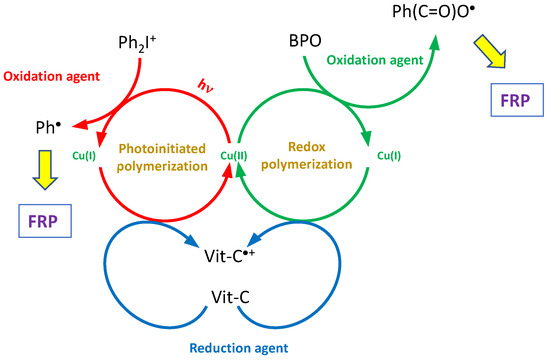 - Garra, P.; Dietlin, C.; Morlet-Savary, F.; Dumur, F.; Gigmes, D.; Fouassier, J.-P.; Lalevée, J. Redox two-component initiated free radical and cationic polymerizations: Concepts, reactions and application. Prog. Polym. Sci. 2019, 94, 33–56. [Google Scholar] [CrossRef]