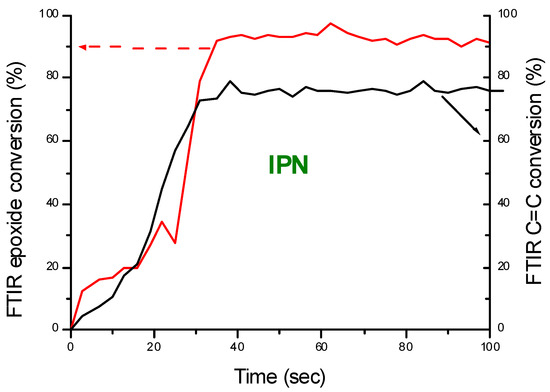 Finally, by the simultaneous presence of Ph-NVK• and Ph-NVK+ within the resin, the formation of interpenetrated polymer networks (IPNs) resulting from the concomitant polymerization of EPOX and TMPTA could be prepared. Interestingly, two different situations could be evidenced, with a higher monomer conversion of EPOX under air compared to that of TMPTA and the opposite situation in laminate (See Figure 6). These results were assigned to the fact that the FRP of TMPTA was going faster than the FRPCP of EPOX, but also to the fact that under air, part of the generated radicals are consumed by oxygen, reducing the TMPTA conversion.
