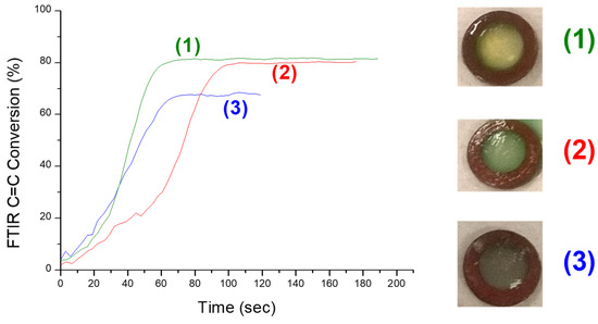 Polymerization profiles of the mixture of monomers by varying the light intensity upon irradiation with a LED@405 nm under air, 1.4 mm thick samples. Reproduced with permission from the authors of [28]. Copyright 2017 American Chemical Society.