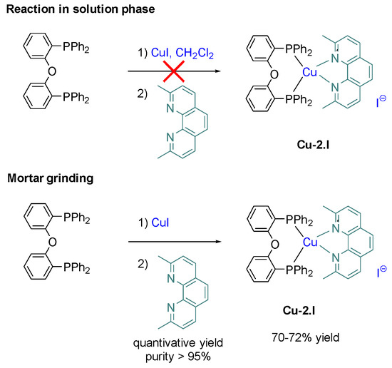 Synthesis of photoinitiators by Green synthetic routes is an active research field, and, in 2018, the synthesis of Cu-2 was newly examined in the context of mechanochemistry [104]. Indeed, the synthesis of photoinitiators in solution and the associate waste treatment can constitute a major obstacle for further developments and commercialization of photoinitiators. Mechanosynthesis underwent a revival of interest approximately ten years ago [105,106,107,108,109,110,111], by offering a unique opportunity to produce molecules by mean of safer, cleaner, and faster transformations than that proposed by the traditional solution-phase chemistry [112,113,114]. Mechanochemistry can also give access to molecules that are impossible to reach in solution phase chemistry [115,116,117,118,119] and a relevant example of this was provided Cu-2 bearing an iodide counteranion. Indeed, due to the low ionicity of the Cu–I bond (~12%), this bond cannot be dissociated in solution. On the opposite, forces brought by mechanochemistry are different from those obtained by heating in solution phase chemistry so that Cu-2.I could be obtained in 70–72% yield with a purity higher than 95% (See Scheme 2).