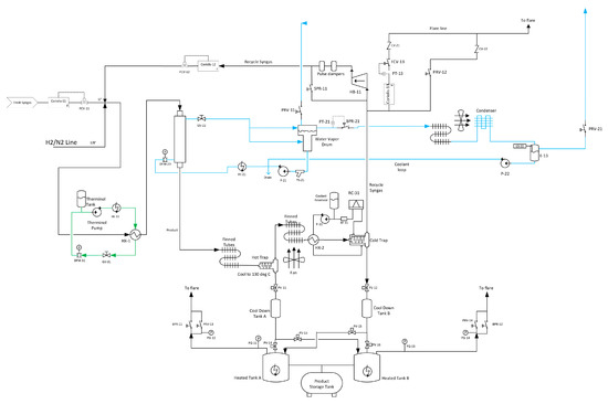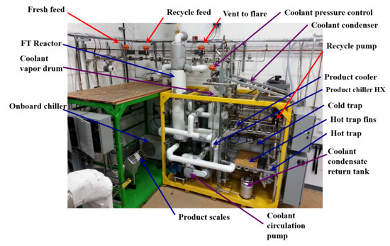 Commercial tubular fixed-bed reactors for FTS offer scalable solutions for off-shore and remote synthetic fuel production applications [18,19]. The potential challenges associated with using the reactors for FTS are the likely high-pressure drops, low catalyst utilization, and insufficient removal of the heat generated during the exothermic reaction [18]. OxEon Energy developed the reactor used in this study (Figure 1) along with the cooling fin (Figure 2) after having several years of experience working with the hydrogenation of syngas (CO and H2) to hydrocarbons using cobalt- and iron-based catalysts [18]. Industry standard FT tube size is typically under 1″. OxEon Energy is able to use a larger tube size because of the thermal management structure shown in Figure 1 and Figure 2 that distributes the heat throughout the catalyst bed produced by the exothermic FT reaction. Optimizing the hydrogenation reactions in the larger reactor tube size will drastically reduce the number of tubes required for a process. This was intended to reduce long-term fabrication and catalyst servicing costs [18]. The reactor and the skid that supports the hydrogenation reactions in this test series are pictured in Figure 3.