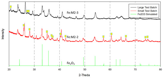 X-ray diffraction analysis in Figure 5 revealed that both Fe:M2-2 and Fe:M2-3 contain the same iron oxide crystal phase (Fe2O3 hematite), but the support phases between the two catalyst are clearly different. Yellow tick marks have been added to the pattern to indicate discrepancies between the Fe:M2-2 and Fe:M2-3 catalysts. When compared to the hematite simulated pattern, it is evident that both catalysts contain the iron oxide phase, leading to the conclusion that the support is the primary difference between the two catalysts. Unfortunately, no one alumina or aluminosilicate phase we examined accurately matches the supports in question. In summary, it is clear that these catalysts are different compositionally and crystallographically from one another. After providing further evidence to the supplier on the differences in catalyst support, the supplier revealed that different supports were in fact used between the small-scale catalyst batch Fe:M2-2 and the large-scale catalyst batch Fe:M2-3. While it was believed that little difference in chemical activity existed between the two supports, this difference ultimately led to the decrease in activity of Fe:M2-3 relative to the Fe-M2-2 small-scale catalyst test batch measured at the laboratory scale.
