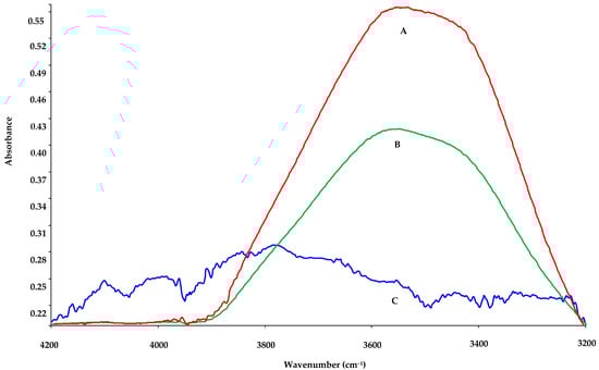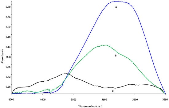 FT-IR spectra of the O-H region of Ga-BaY(IS) calcined at (A) 250 °C, (B) 550 °C, (C) 750 °C.