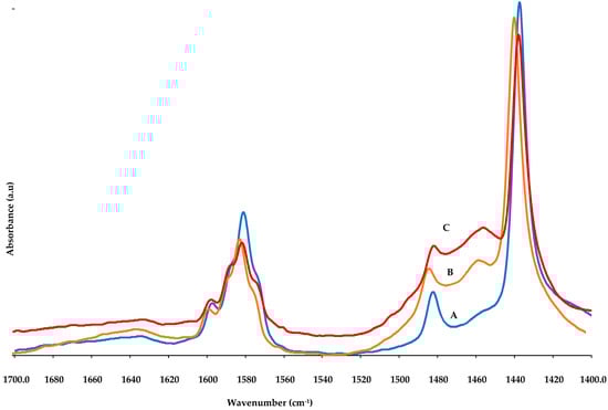 Pyridine-IR spectra of Ga-BaY(Sil) calcined at (A) 250 °C, (B) 550 °C, (C) 750 °C.
