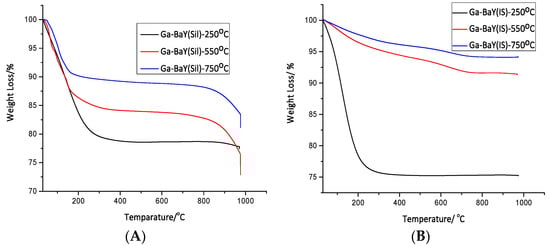 Thermogravimetric analysis curves of (A) Ga-BaY(Sil) and (B) Ga-BaY(IS) calcined at different temperatures.