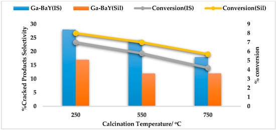 Catalytic testing results shown in Figure 7 were obtained under similar testing conditions (Temperature = 450 °C, GHSV = 6000 h−1, C:O ratio = 8:1, and catalyst = 1 mL). Ga-BaY(Sil) calcined at different temperatures showed higher conversions when compared to Ga-BaY(IS) calcined under similar conditions. The higher conversions over Ga-BaY(Sil) catalysts may be attributed to the higher loading of Ga compared to the Ga-BaY(IS) catalysts, namely, three magnitudes higher. Conversion over both the catalysts decreased with increasing calcination temperature, and this suggests that as the calcination temperature increases, dehydroxylation of the catalysts leads to the decrease in the concentration of hydroxyl groups responsible for the Brønsted acid sites, which in turn decreases the activity of the catalysts. The selectivity to cracked products, which are a result of the acidity of the catalyst, also decreases with the calcination temperature. This also suggests the decrease in the concentration of the Brønsted acid sites as the calcination temperature is increased. The low cracking activity shown by catalysts calcined at 750 °C results from the induced Lewis acid sites from the dehydroxylation and migration of the framework cations. This is supported by the results shown in Table 3.