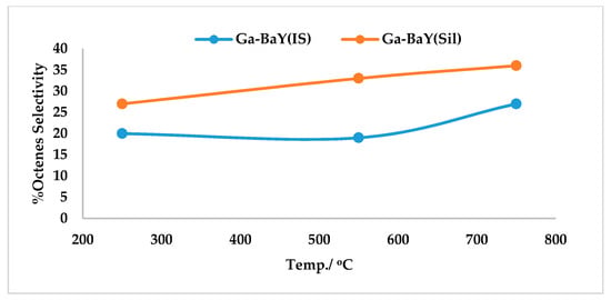 Octene selectivity of Ga-BaY(IS) and Ga-BaY(Sil) calcined at different temperatures.