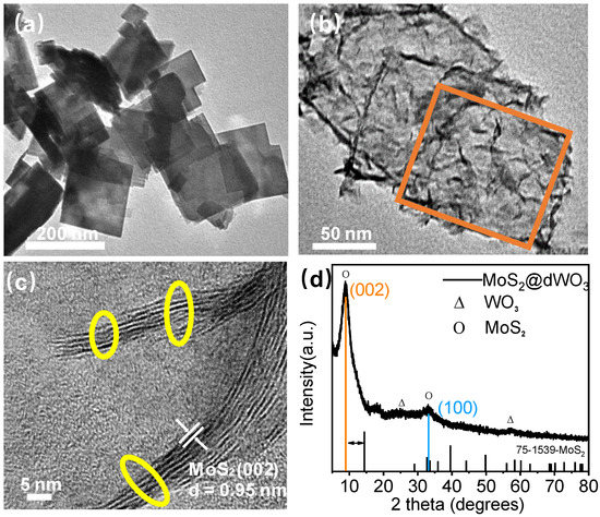 Synthesis and structure characterization. (a) TEM image of pure tungsten oxide (WO3); (b) TEM image of MoS2@dWO3. At the image, the orange circle indicated frame of WO3; (c) HRTEM image of MoS2@dWO3. At the image, the yellow circle indicates the active edges of MoS2; (d) XRD patterns of MoS2@dWO3 heterostructures nanosheets.