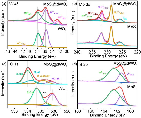 Chemical state and electronic properties of the catalyst surface was further detected by X-ray photoelectron spectrum (XPS). As shown in Figure 2, XPS survey scan confirmed the presence of W, Mo, O and S elements in MoS2@dWO3 heterostructure. Compared with pure WO3, a distinctive new peak assigned to W4+4f7/2 was appeared around 32.5 eV, indicating that the wet etching of pristine WO3 would induce the electron transfer from oxygen vacancies to tungsten cations on the defective WO3 surface (Figure 2a). Moreover, a positive shift and peak broadening of both W6+ 4f7/2 and W6+ 4f5/2 demonstrates the electron modulation and recombination of different compound between defective WO3 and in situ grown MoS2 [43]. In Figure 2b, the Mo 3d XPS spectrum of MoS2@WO3 had two characteristic peaks of Mo4+ 3d3/2 (231.75 eV) and Mo4+ 3d5/2 (228.65 eV), indicating the dominance of MoS2 in the product. However, the enhanced peak of Mo 6+ 3d5/2 (232.63 eV) and Mo 6+ 3d3/2 (235.73 eV) represents the formation of Mo–O bonds [32,44], verifying that the oxygen was incorporated into MoS2-layer to generate the interlayer disorder, which also corresponds to the peak shit of S. As shown in Figure 2c, the O 1s spectrum revealed the existence of W–O–W (530.53 eV) and O-vacancies (531.68 eV) [18] in MoS2@dWO3. The increase of O-vacancies peak area indicates the enhancement of O-vacancies after the formation of heterostructure. Meanwhile, the appearance of new peak at 533.46 eV is ascribed to Mo–O bond, indicating a certain amount of oxygen atoms were incorporated into the layered MoS2 structure. The C–OH peak in the O 1s spectrum mainly comes from the glucose ligand on the surface. All the positions of S 2p1/2, S 2p 3/2 peak were in accordance with the previous literature (Figure 2d) [24]. However, we observed that the peak of S2- 2p3/2 have 0.05 eV shift toward low blinding energy, which indicated that S became easier to obtain electrons after forming heterostructure [45] and also confirmed peak of Mo 6+ 3d5/2 (232.63 eV) and Mo 6+ 3d3/2 (235.73 eV) were further enhanced because of the conservation of gain and loss electrons [5]. In summary, formation of heterostructure caused the increase of O-vacancies on the defective WO3 surface and the generation of Mo–O bond by oxygen incorporation into MoS2 layer.