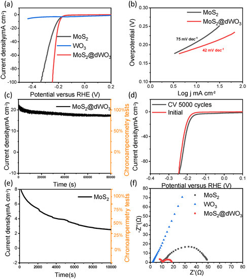 Electrocatalytic hydrogen evolution reaction performance. (a) Polarization curves of MoS2, WO3 and MoS2@dWO3 (b) corresponding Tafel plots of MoS2 and MoS2@dWO3; (c) degree of decline of MoS2@dWO3 through the 80,000 s continuous operation (d) polarization curves of MoS2@dWO3 initially and after 5000 cyclic voltammetry (CV) sweeps; (e) degree of decline of MoS2 through the 10,000 s continuous operation; (f) electrochemical impedance spectroscopy of MoS2, WO3 and MoS2@dWO3.