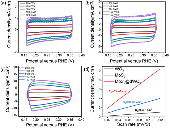 In order to further evaluate the effective electrochemical active surface area (ECSA) of MoS2, WO3 and MoS2@dWO3, the electrochemical double-layer capacity (Cdl) was further examined as shown in Figure 4. The double layer capacitance (Cdl) of MoS2@dWO3 is 83 mF cm−2, which is higher than that of pristine WO3 (8 mF cm−2) and pure MoS2 (30 mF cm−2). The plots in Figure 4d show that the MoS2@dWO3 have a large active surface area, which can be attributed to the heterostructure with rich active edge sites. Our experiment measurement indicates a strong dependence in the catalytic activity of the MoS2 film on the WO3 substrate.