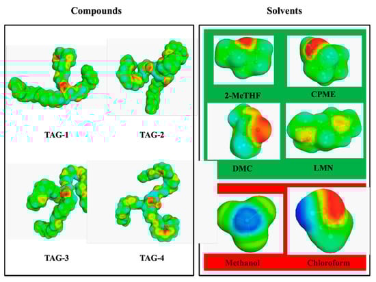 Model of α-surfaces by COSMO-RS of compounds and solvents used in the theoretical study. Compounds (TGAs): TAG-1 (R1 (C16:0); R2 (C22:6n3); R3 (C16:0)); TAG-2 (R1 (C18:1n9); R2 (C20:5n3); R3 (C16:0)); TAG-3 (R1 (C18:1n9); R2 (C22:6n3); R3 (C18:1n9)); TAG-4 (R1 (C22:6n3); R2 (C22:6n3); R3 (C22:6n3)). Green solvents (green color): 2-methyltetrahydrofuran (2-MeTHF), cyclopentyl methyl ether (CPME), dimethyl carbonate (DMC) and limonene (LMN). Reference solvent (red color): Folch reagent (FR), chloroform/methanol (2:1, v/v).
