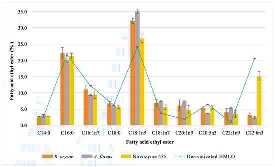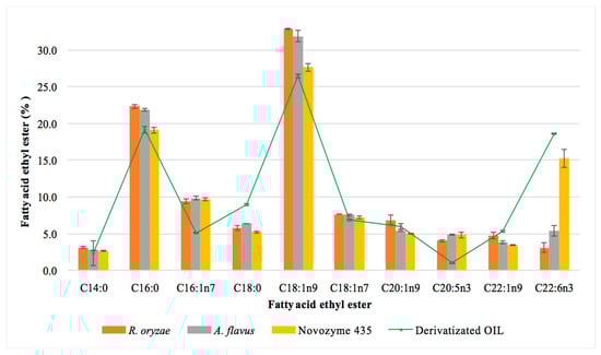 The main FAEEs obtained in the one-step reaction studied using the three biocatalysts are shown in Figure 4. The commercial enzyme and the fungal resting cells led to different fatty acid ethyl esters contents. The results corresponding to the percentage of each fatty acid is always referred to as the initial content of the corresponding fatty acid in the MLO. Thus, taking into account the total content of each fatty acid in the MLO (Table 3), and specifically the PUFAs (DHA, 15.2% and EPA, 4.4%), we can conclude that the commercial enzyme esterified 90% of DHA and 100% of EPA. This result shows that this enzyme does not discriminate between the different fatty acids to synthesize the FAEEs. Similar results have previously been described for this commercial enzyme [38,39], which indicates that it is a suitable biocatalyst for the synthesis of these omega-3 EEs. In contrast, the resting cells showed the lowest yields for the esterification of PUFAs, mainly DHA. A. flavus showed the highest yield of DHA-EE (38%) of the two resting cells studied; R. oryzae only esterified 22% of DHA present in the fish oil after a 72 h reaction; no differences were observed for the esterification of EPA. This finding suggested that lipases from R. oryzae discriminated between the different PUFAs present in the MLO. The selectivity of enzymes has been reported by different authors who suggested that some lipases could be selective for certain types of fatty acid depending on their chain length, the solvent used in its extraction and purification, the method of immobilization used for the enzyme and the reaction conditions (temperature and time) [54,55,56,57]. The selectivity showed by the resting cells from R. oryzae could facilitate the separation of the DHA from the mixture of FAEEs.