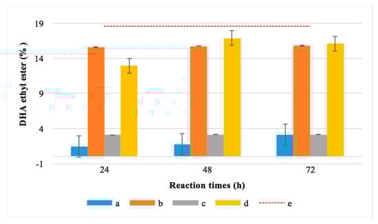 Percentage of docosahexaenoic acid (DHA) before and after total chemical esterification for 24, 48 and 72 h using R. oryzae lipase and chemical catalysis. (a) Blue color: ester obtained before chemical catalysis from one-step esterification with R. oryzae. (b) Orange color: ester obtained after applying chemical catalysis to the crude resulting from one-step transesterification. (c) Grey color: ester obtained before catalysis from two-step esterification. (d) Yellow color: ester obtained after applying chemical catalysis to the crude resulting from the two-step esterification. (e) Red dotted line: total DHA content in the MLO.