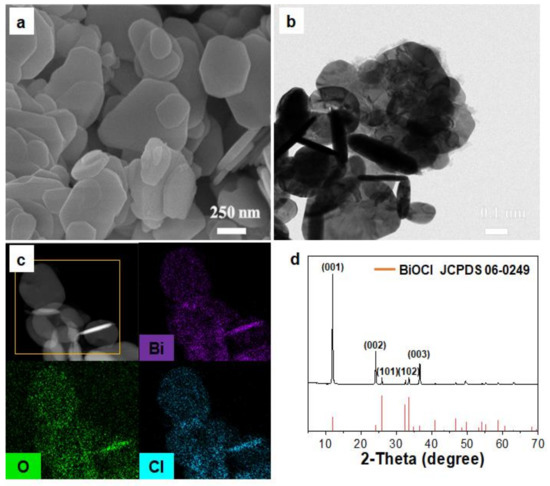 (a) Scanning electron microscopy (SEM) image, (b) transmission electron microscopy (TEM) image, (c) Scanning transmission electron microcopy (STEM) and energy-dispersive X-ray spectrometry (EDS) mapping images, and (d) X-ray diffractometry (XRD) patterns of the bismuth oxychloride (BiOCl) nanoplates.