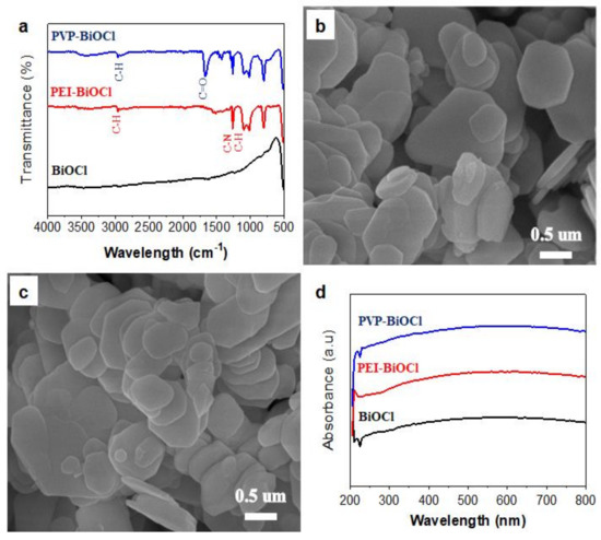(a) Fourier-transform infrared spectroscopy (FT-IR) spectra of BiOCl nanoplates. SEM images of (b) polyvinylpyrrolidone (PVP)-stabilized and (c) polyethyleneimine (PEI)-stabilized BiOCl nanoplates. (d) UV-Vis spectra of BiOCl nanoplates.